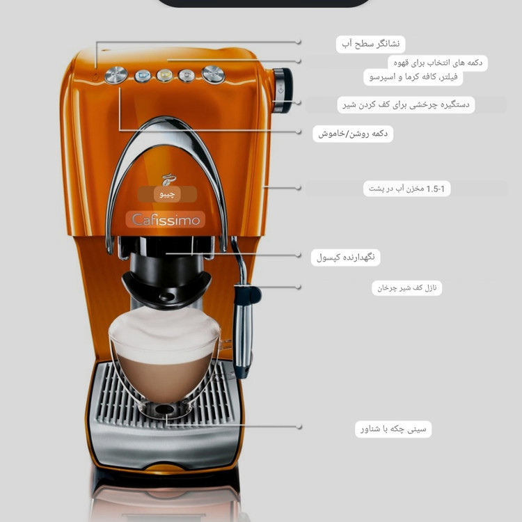 ثبت اختراع سیستم دمآوری سه فشار: سیستم دمآوری Cafissimo به اسپرسو، کرمهای کافه، قهوه فیلتر و کاپو چینو لاته ماکیاتو و چای شما اجازه میدهد عطر و بوی شدیدی داشته باشید.لوله ناظری کننده شیرعملکردآب گرم برای چای آسان و ناظر بخار با فشار بخار عالی برای درست کردن فوم و گرم کردن شیر و آبجوش برای چای.انعطاف پذیر: استفاده آسان با لمس یک دکمه، مقدار نوشیدنی قابل برنامه ریزی آزادانه، دهانه قهوه قابل تنظیم و میز فنجان قابل جابجایی. ظرفیت بالا: ظرف جمع آوری کپسول یکپارچه می تواند مخزن آب قابل جابجایی تا 1/5 لیتر را نگه می دارد. سریع و قابل اطمینان: گرمایش سریع در 45 ثانیه و کارآمد انرژی به لطف عملکرد خاموش شدن خودکار پس از 7 دقیقه. متناسب با هر آشپزخانه ای طراحی شیک خود در هر آشپزخانه ای قرار می گیرد.