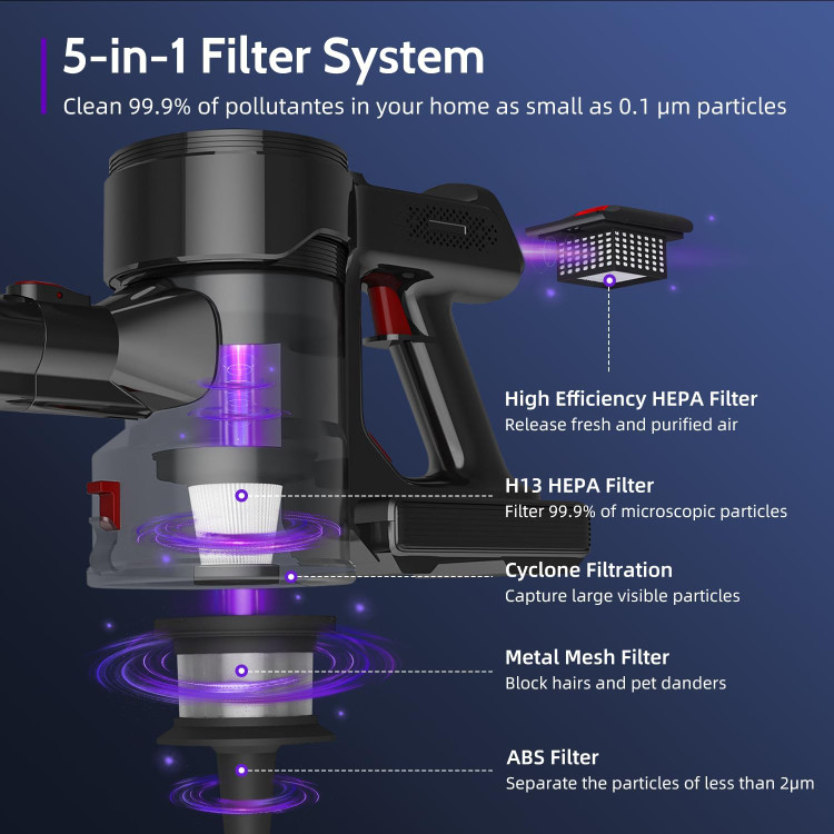سیستم فیلتر 5 لایه این جارو، ذرات بزرگ، مو، ذرات ریز و باکتریها را به طور موثر فیلتر میکند و فیلتر HEPA H13 آن، هوای تازه و پاکیزهای را تضمین میکند.