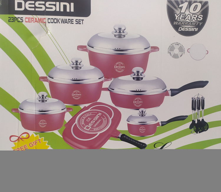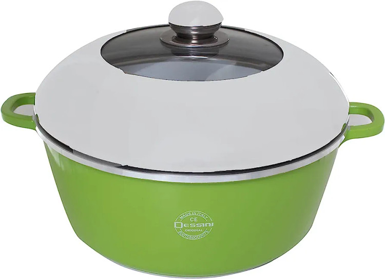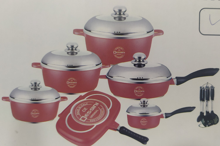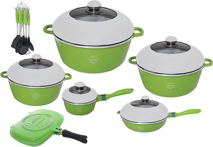 و البته سرویس قابلمه ۲۲ پارچه Dessini دارای یک ست زیبای کفگیر ملاقه نیز هست.بدنه این سرویس قابلمه از چدن و آلومینیوم تولید شده که دارای بهترین کیفیت برای طبخ غذاست. بدین صورت که بهترین رسانای گرما آلومینیوم است و چدن هم به بهترین نحو ممکن دما را پخش می کند.